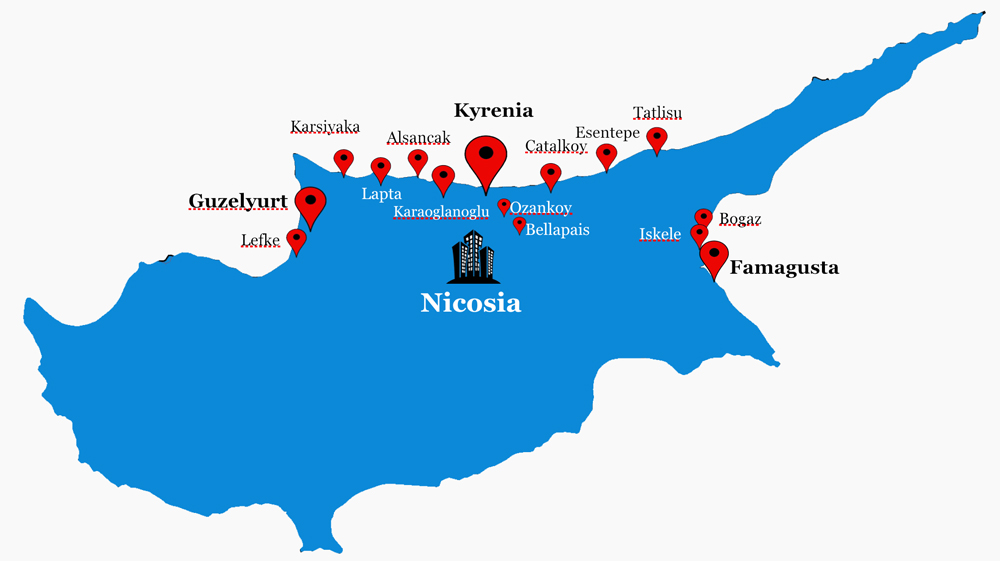 Städer: Nicosia (huvudstad), Kyrenia, Famagusta, Guzelyurt och Iskele